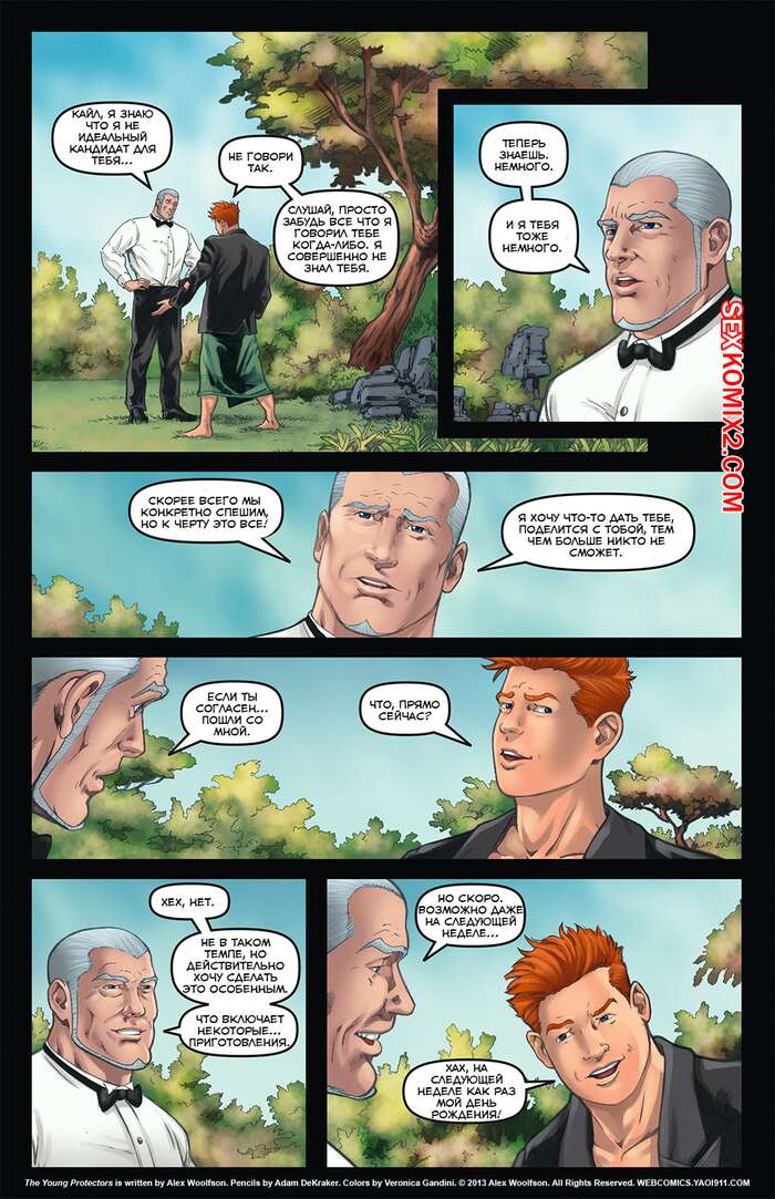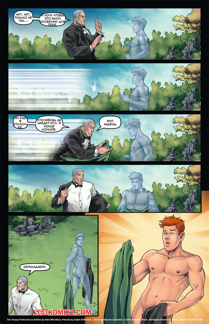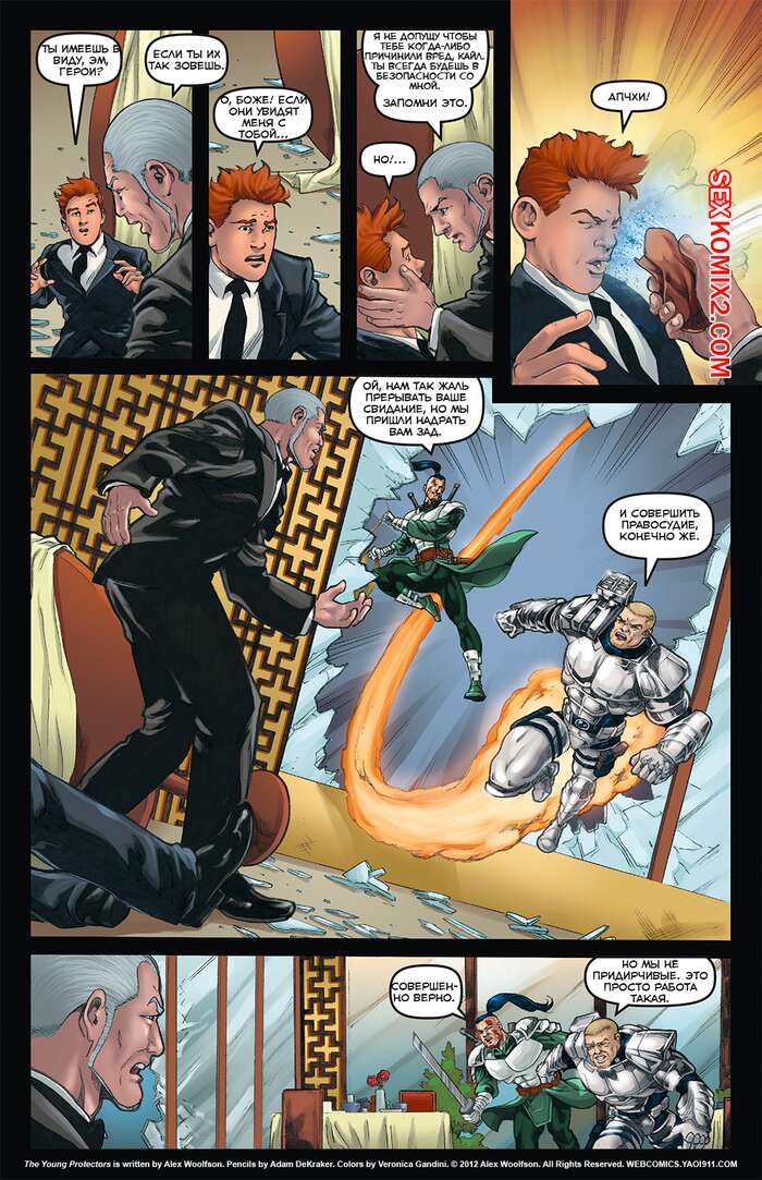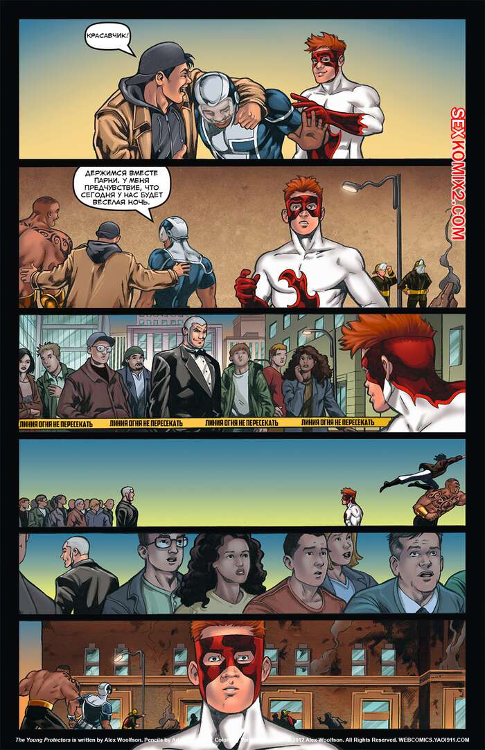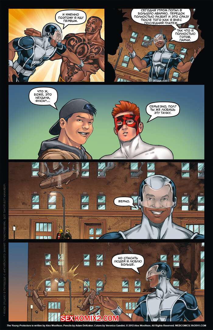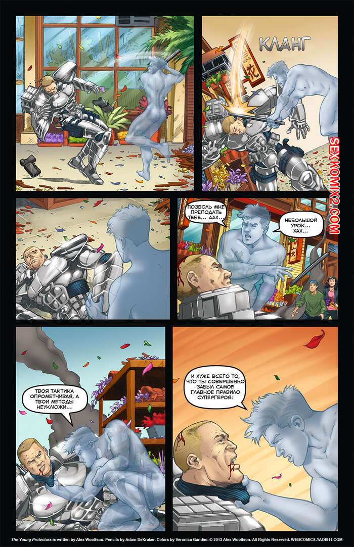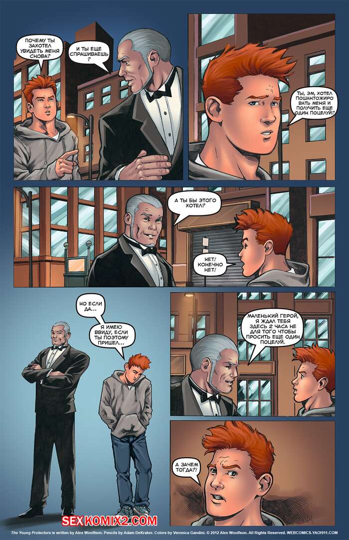 Порно комикс Юные Защитники. Часть 1. Привлечение Врага. Парень на своем первом задании отлично себя показал, и его приняли в команду супер героев. Но все не так просто, на него положил глаз их лидер и хочет ближе с ним познакомится.