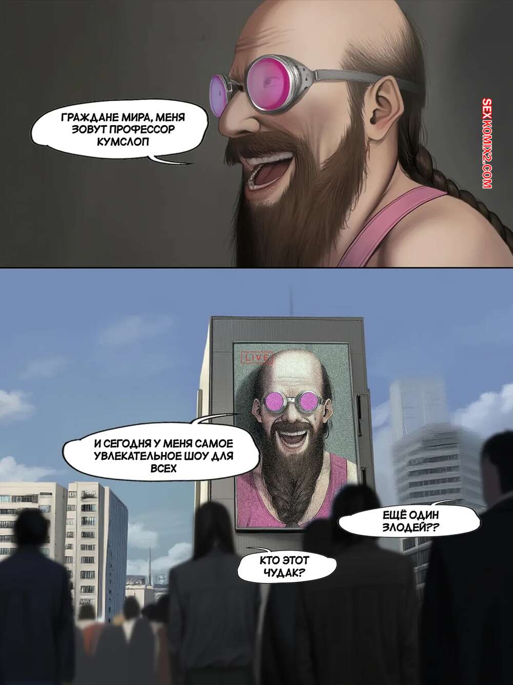 ΠΠΎΡΠ½ΠΎ ΠΊΠΎΠΌΠΈΠΊΡ One Punch Man. ΠΠΎΡΠ»Π΅Π΄Π½ΡΡ ΠΏΠ΅ΡΠ΅Π΄Π°ΡΠ° ΡΠ΅Π»ΠΎΠ²Π΅ΡΠ΅ΡΡΠ²Π°. Humanitys Last Broadcast. FEFanatica Π’Π΅Π»Π΅ΡΡΡΠ΄ΠΈΡ ΡΡΠ°Π»Π° ΠΏΠΎΠΊΠ°Π·ΡΠ²Π°ΡΡ Π»ΠΈΡΡ ΠΎΠ΄Π½Ρ ΠΏΡΠΎΠ³ΡΠ°ΠΌΠΌΡ Π²ΠΎ Π²ΡΠ΅ΠΌ Π³ΠΎΡΠΎΠ΄Π΅. ΠΠ° Π±ΠΎΠ»ΡΡΠΎΠΌ ΡΠΊΡΠ°Π½Π΅ Π² ΡΠ΅Π½ΡΡΠ΅ Π³ΠΎΡΠΎΠ΄Π° Π·ΡΠΈΡΠ΅Π»ΠΈ Π²ΠΈΠ΄ΡΡ Π·Π°ΠΊΠΎΠ²Π°Π½Π½ΡΡ Π² ΡΠ΅ΠΏΠΈ Π’Π°ΡΡΠΌΠ°ΠΊΠΈ, ΠΊΠΎΡΠΎΡΡΡ Π»Π°ΡΠΊΠ°ΡΡ Π½Π΅ΡΠΊΠΎΠ»ΡΠΊΠΎ ΠΏΠ°ΡΠ½Π΅ΠΉ, Π° Π·Π°ΡΠ΅ΠΌ ΡΡΠ°Ρ