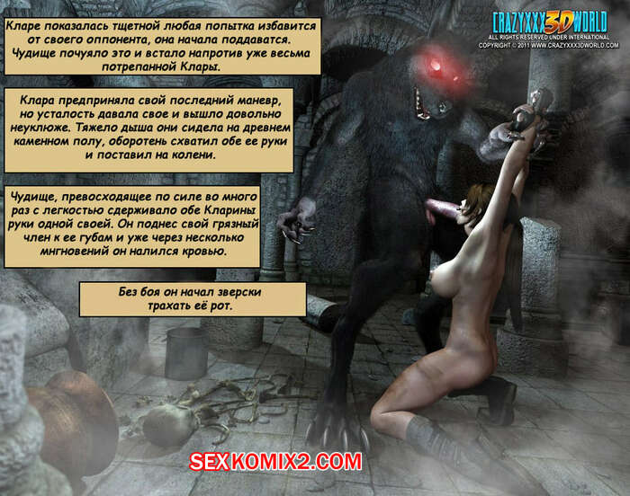 Порно комикс Клара Рэвенс. Часть 2. Превосходство Агамемнона На красотку, искательницу приключений, напал монстр с огромным хуем. Он силой схватил красотку и раздел ее, а затем принялся ебать ее ротик, а затем вставил член в пизду и хорошенько отъебал.