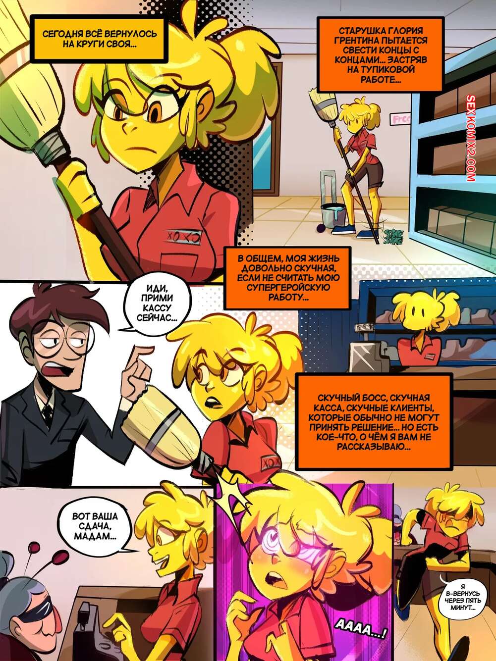 ΠΠΎΡΠ½ΠΎ ΠΊΠΎΠΌΠΈΠΊΡ ΠΡΠ°ΡΠΎΠ²Π°Π½Π½Π°Ρ Π·Π»ΠΎΠ΄Π΅Π΅ΠΌ. Spellbound in Villainous. Spellbinder Comics. ΠΠΎΡΡΡΠ°Ρ Π±Π»ΠΎΠ½Π΄ΠΈΠ½ΠΊΠ° Π·Π°Π½ΠΈΠΌΠ°Π»Π°ΡΡ ΡΠ°Π±ΠΎΡΠΎΠΉ Π² ΠΌΠ°Π³Π°Π·ΠΈΠ½Π΅, Π½ΠΎ Π²Π½Π΅Π·Π°ΠΏΠ½ΠΎ ΠΎΠ½Π° ΠΏΠΎΡΡΠ²ΡΡΠ²ΠΎΠ²Π°Π»Π° ΡΠΈΠ»ΡΠ½Π΅ΠΉΡΠ΅Π΅ Π²ΠΎΠ·Π±ΡΠΆΠ΄Π΅Π½ΠΈΠ΅. ΠΡΠ°ΡΠΎΡΠΊΠ° ΠΎΡΠΏΡΠ°Π²ΠΈΠ»Π°ΡΡ Π² ΡΡΠ°Π»Π΅Ρ ΠΈ ΡΡΠ°Π»Π° ΡΠ°ΠΌ Π»Π°ΡΠΊΠ°ΡΡ ΡΠ²ΠΎΡ ΠΏΠΈΠ·Π΄Π΅Π½ΠΊΡ.