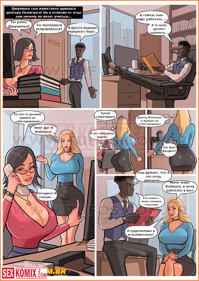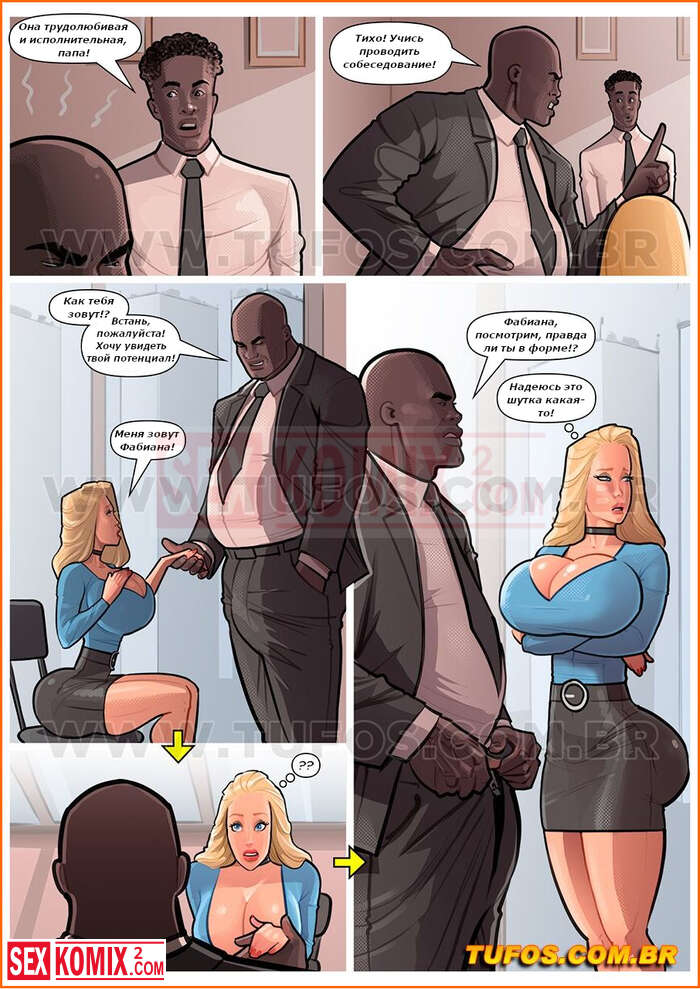 Порно комикс Собеседование на работе. Negroludos. Часть 7. Блондинка пришла устраиваться в крупную компанию на должность юриста. А поскольку проблемы у них бывают, большие босс достал свой большой член и смотрел как она с ним управлялась.