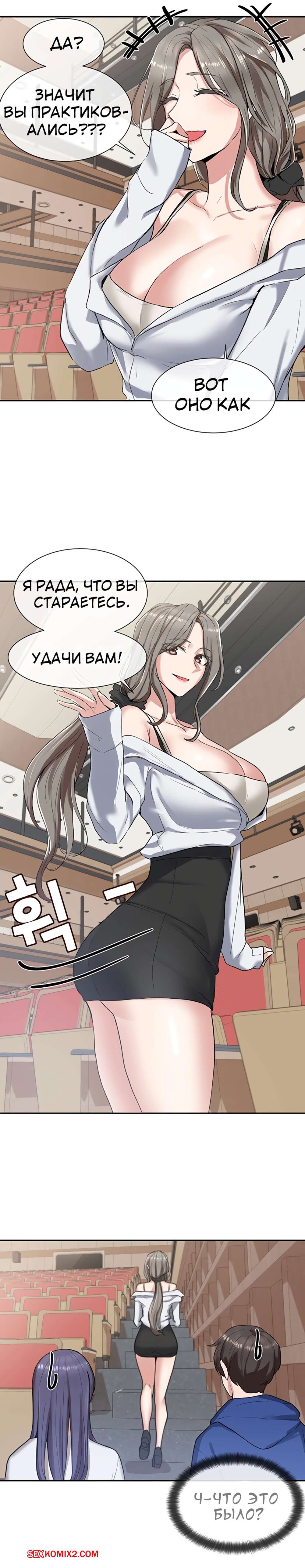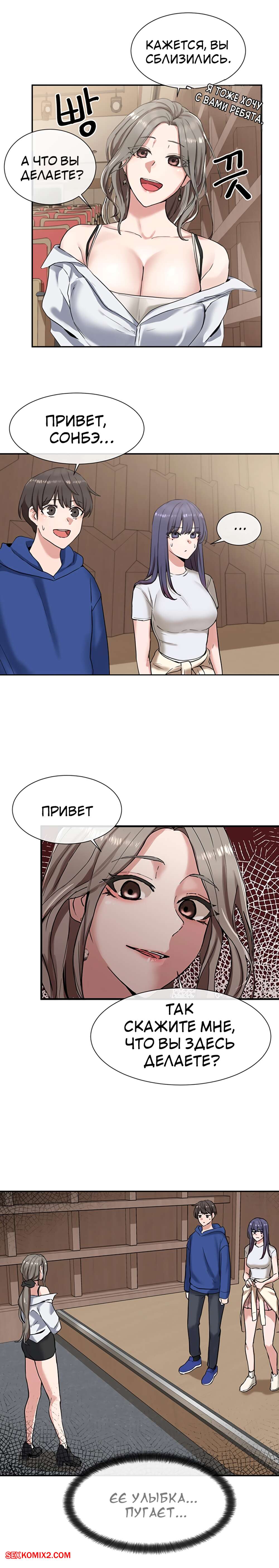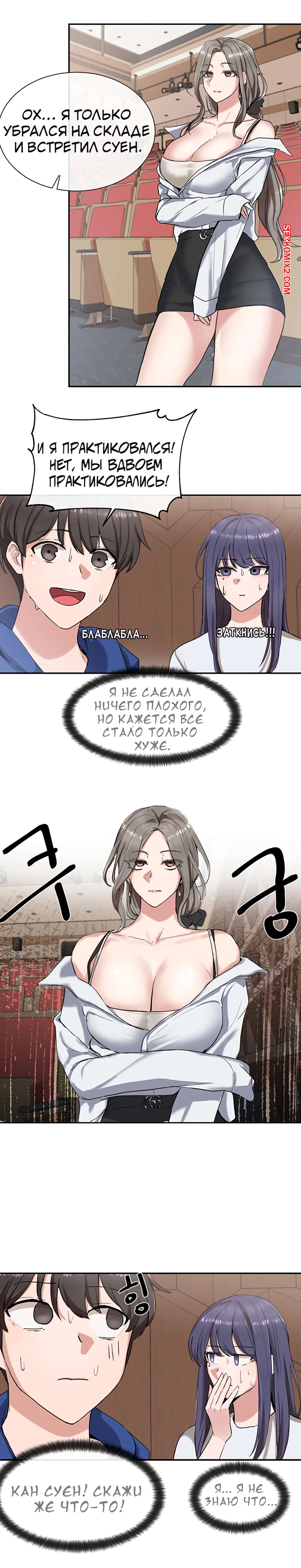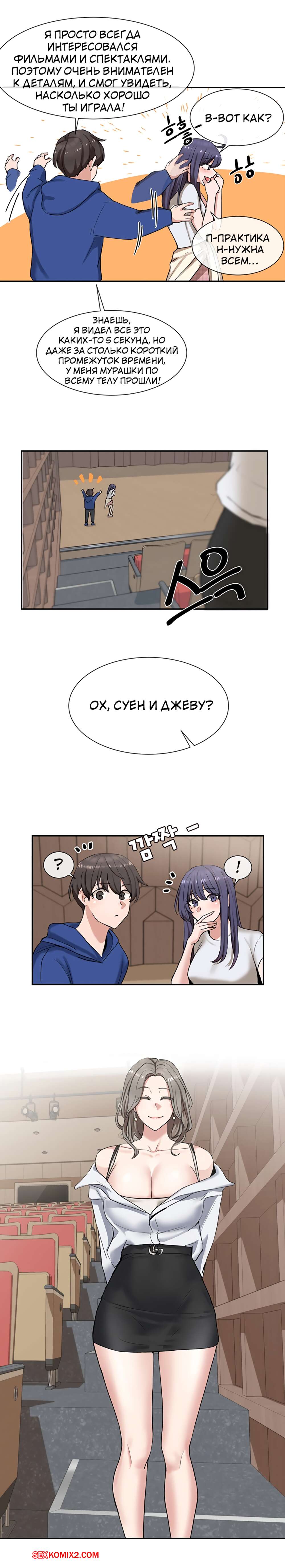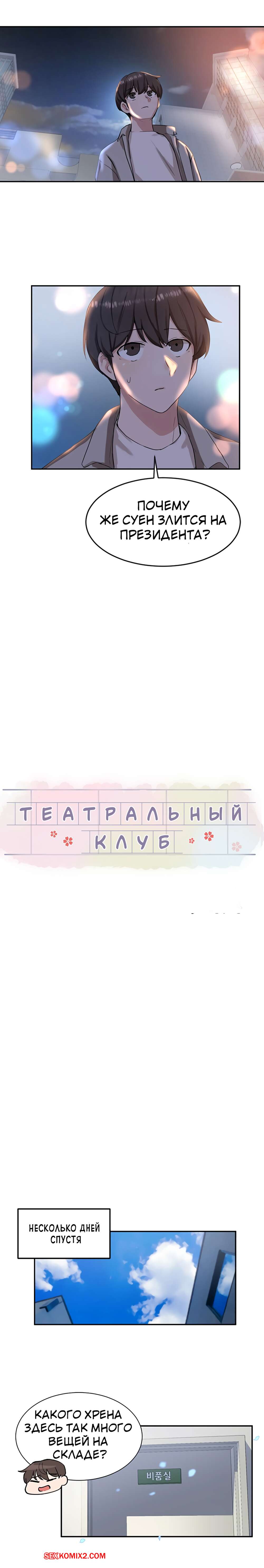 ΠΠΎΡΠ½ΠΎ ΠΊΠΎΠΌΠΈΠΊΡ Π’Π΅Π°ΡΡΠ°Π»ΡΠ½ΡΠΉ ΠΊΠ»ΡΠ±. Π§Π°ΡΡΡ 7 ΠΈ 8 ΠΈ 9. Theater cociety ΠΠΎΠ»ΠΎΠ΄ΠΎΠΉ ΠΏΠ°ΡΠ½ΠΈΡΠΊΠ° ΠΎΡΡΠ°Π»ΡΡ ΠΎΠ΄ΠΈΠ½ Π½Π° ΠΎΠ΄ΠΈΠ½ ΡΠΎ ΡΠ²ΠΎΠ΅ΠΉ ΡΠ΅ΠΊΡΠ°ΠΏΠΈΠ»ΡΠ½ΠΎΠΉ ΡΠΈΡΡΡΡΠΎΠΉ ΠΏΠΎΠ΄ΡΡΠ³ΠΎΠΉ. ΠΠ½Π° Π±ΡΠ»Π° ΠΎΡΠ΅Π½Ρ Π²ΠΎΠ·Π±ΡΠΆΠ΄Π΅Π½Π°, ΠΏΠΎΡΡΠΎΠΌΡ ΡΠ°ΠΌΠ° ΡΡΠ°Π»Π° ΡΠ°Π·Π΄Π΅Π²Π°ΡΡ ΠΏΠ΅ΡΠ΅Π΄ ΠΏΠ°ΡΠ°Π½ΠΎΠΌ, Π° Π·Π°ΡΠ΅ΠΌ ΠΎΡΡΠ°ΡΡΠ²Π°ΡΡ Π΅Π³ΠΎ Π±ΠΎΠ»ΡΡΠΎΠΉ Ρ ΡΠΉ, ΠΏΠΎΡΠ»Π΅ ΡΠ΅Π³ΠΎ ΡΠ°Π·Π΄Π²ΠΈΠ½ΡΠ»Π° Π½ΠΎΠΆΠΊΠΈ, ΡΡΠΎΠ±Ρ ΠΎΠ½ Π΅Π΅ Ρ ΠΎΡΠΎΡΠ΅Π½ΡΠΊΠΎ ΠΎΡΡΠ΅Π±Π°Π».
