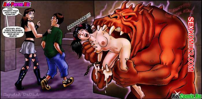 Порно комикс Черная магия. Части 1 и 2 Парень с девушкой схватили молодую красотку, чтобы провести с ней сеанс черной магии. Но они ошиблись и все это привело к появлению ведьмы и ее монстра, которые решили проучить ребят.